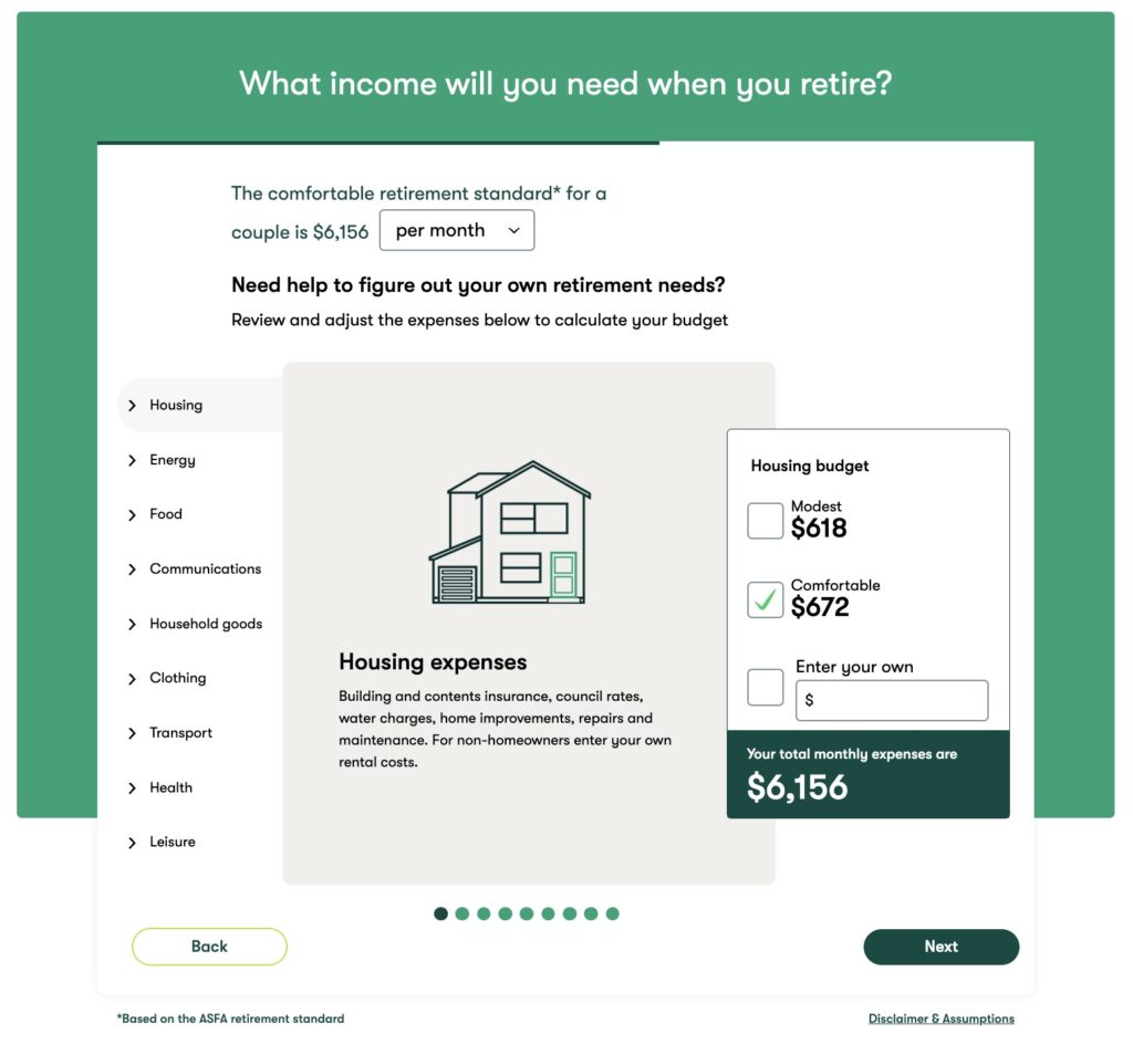 The Retirement Needs calculator helps users understand how retirement balances and income relate to ongoing and one-time retirement expenses across a range of ASFA standard household expenditure categories.
